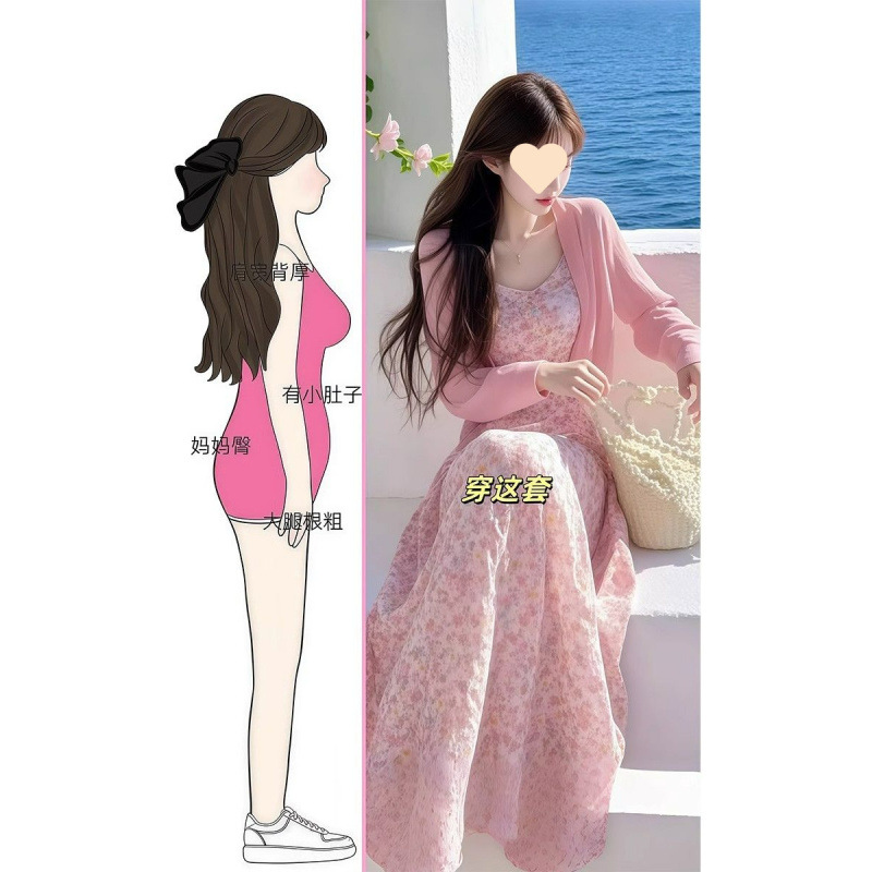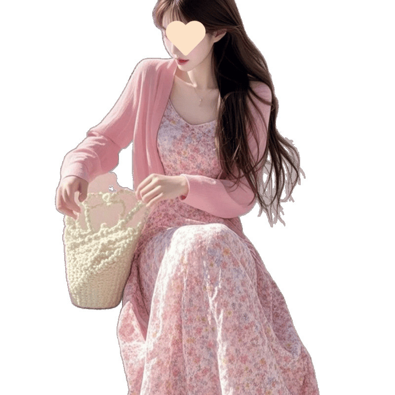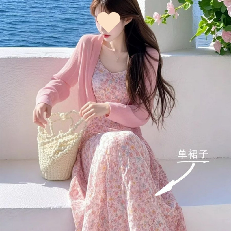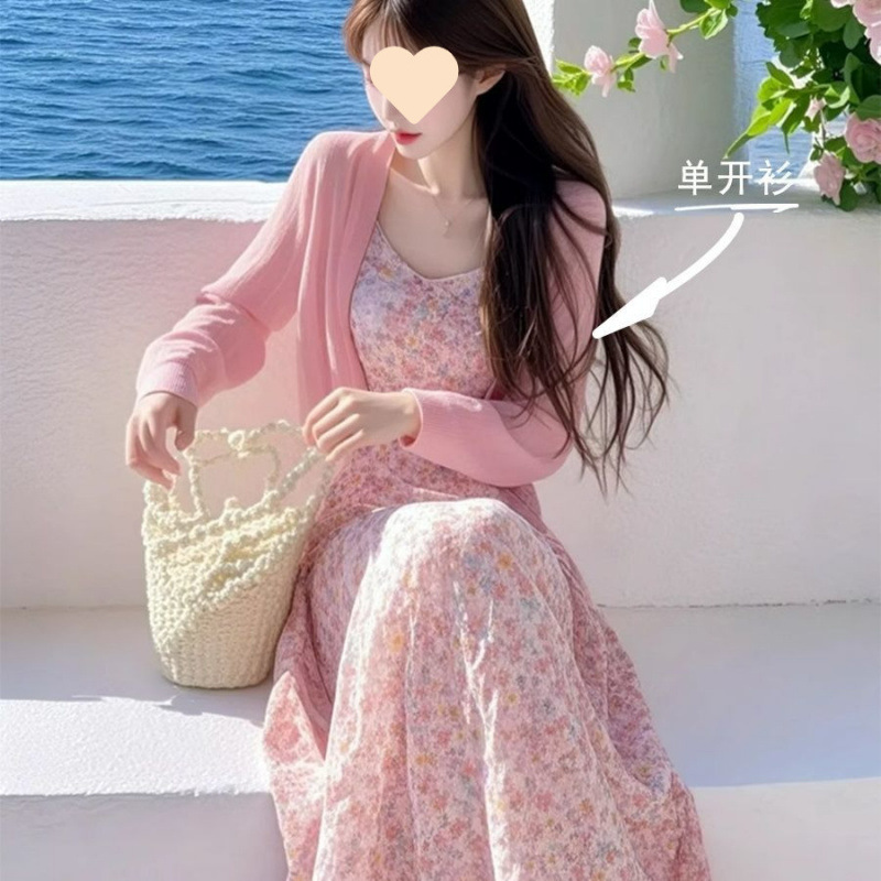 ピンクカーディガン [シングルピース], ピンクカーディガン+花柄ワンピース【2点セット】, ホワイトベースレイヤー【シングル】, 花柄ワンピース【シングルピース】