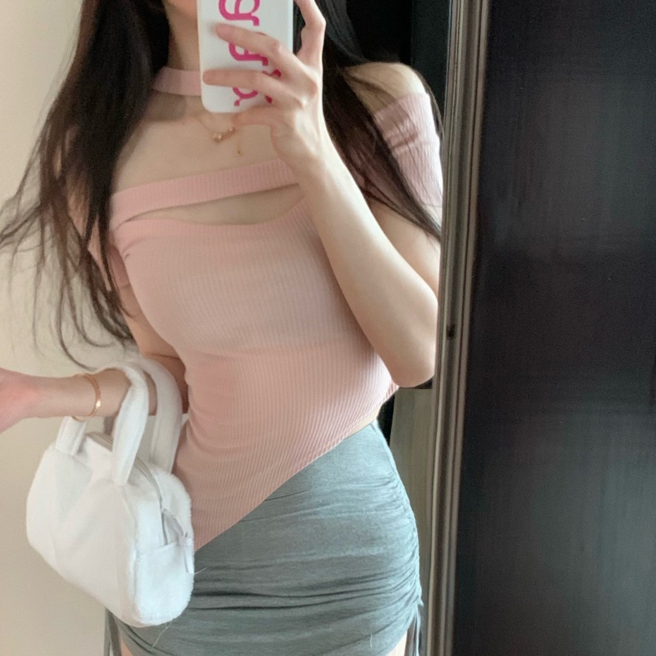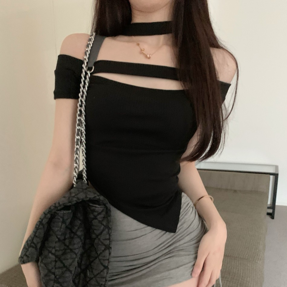 ZY – Spice girl pure lust style halterneck cut-out off-the-shoulder cropped T-shirt women’s design scheming tight base top