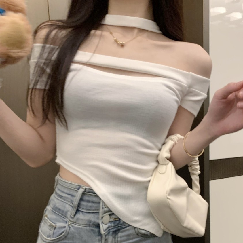 ZY – Spice girl pure lust style halterneck cut-out off-the-shoulder cropped T-shirt women’s design scheming tight base top